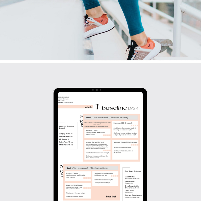 Inside this 4-week jumpstart workout program, you will get a variety of movements and modifications to meet you right where you are and encourage you to push your body to create change.
